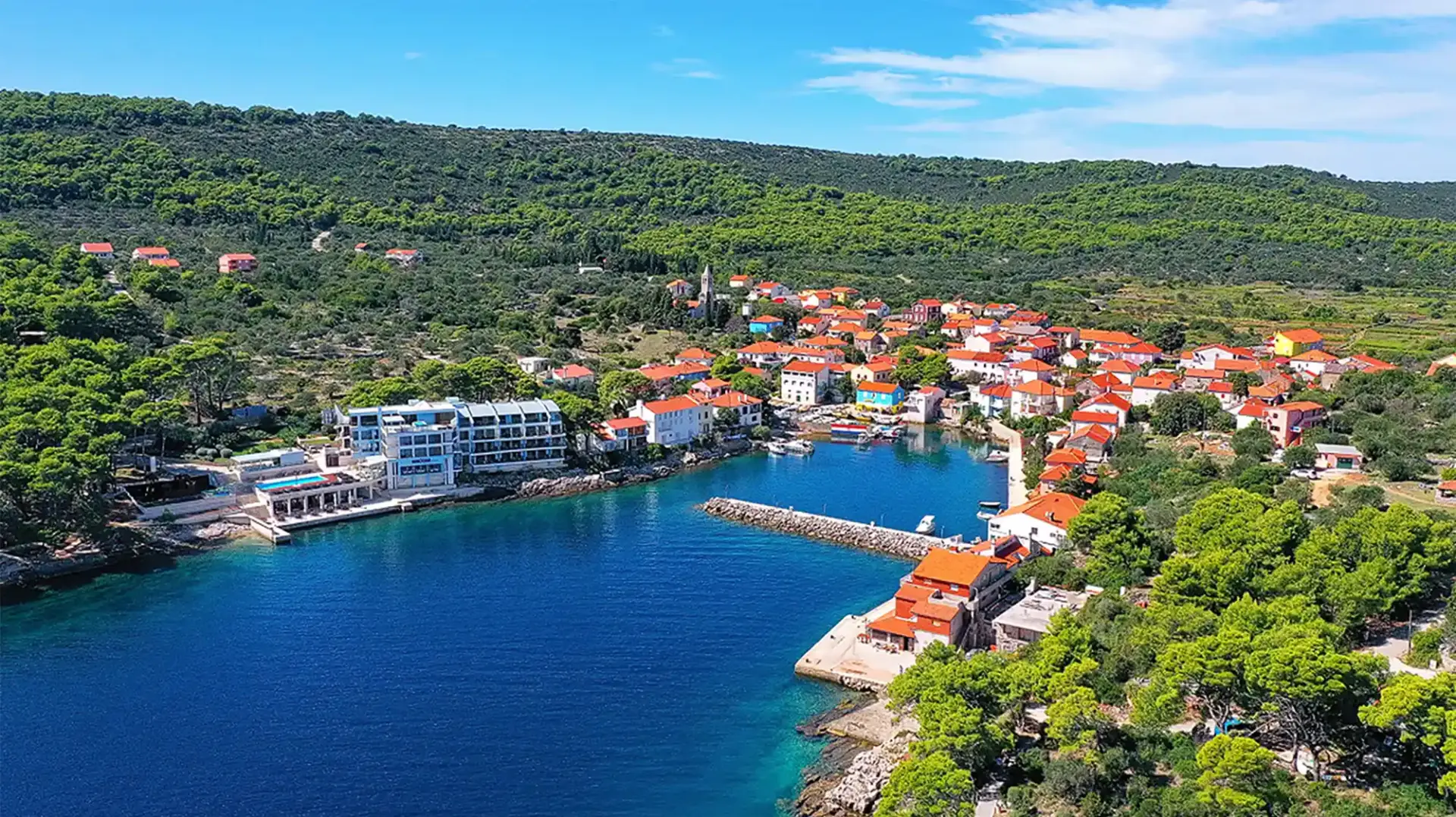 Wenn man von See her auf Božava zusteuert, fällt der Blick unweigerlich auf den großen Hotelkomplex auf der linken Seite der Bucht. Ich bin ehrlich zu euch: Im ersten Moment wirkt dieser Betonbau aus einer anderen Ära vielleicht etwas deplatziert und nimmt ein wenig von der romantischen Erwartung, die man an ein verstecktes Inseldorf hat.