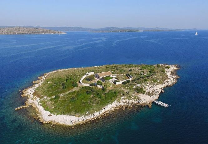 Die einsame Insel mit einem Haus in der Mitte. Der Urlaubstraum liegt in der Nähe der Insel Žut, rund 45 Minuten von Murter entfernt.
