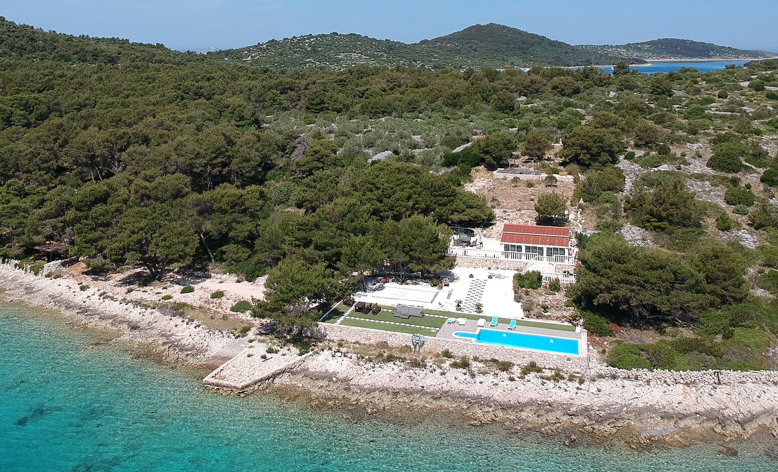 Wenn man von der Bucht Kaprije kommend, nach Nordwesten blickt, kann man das schöne, kleine Haus mit Pool davor, gut ausmachen.