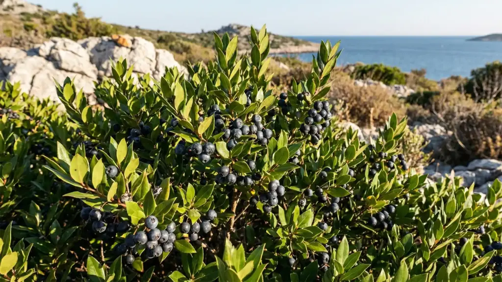 Die Myrte (Myrtus communis) ist eine Pflanze mit Geschichte. Schon in der Antike galt sie als Symbol für Liebe, Fruchtbarkeit und Reinheit. Während sie im Rest Europas oft als Zierpflanze im Topf überlebt, wächst sie auf den Kornaten wild und ungezähmt.
