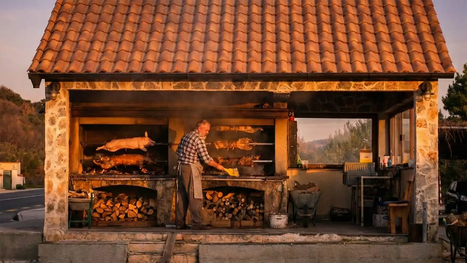 Die Spezialität des Hauses ist ganz klar das Fleisch vom Spieß. Die Kunst liegt in der Geduld. Das langsame Garen über dem Holzfeuer sorgt dafür, dass das Fleisch innen unglaublich saftig und zart bleibt, während die Haut außen diese legendäre, splittrige Knusprigkeit erreicht, für die Menschen kilometerweit fahren.