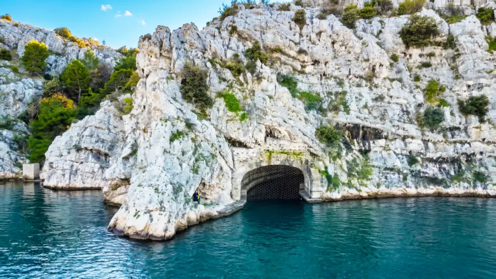 Trotz der idyllischen mediterranen Umgebung hat das Bauwerk einen rein militärischen Ursprung. Der Tunnel wurde gebaut, um Schiffe beinahe unsichtbar mit der Küstenlinie verschmelzen zu lassen.