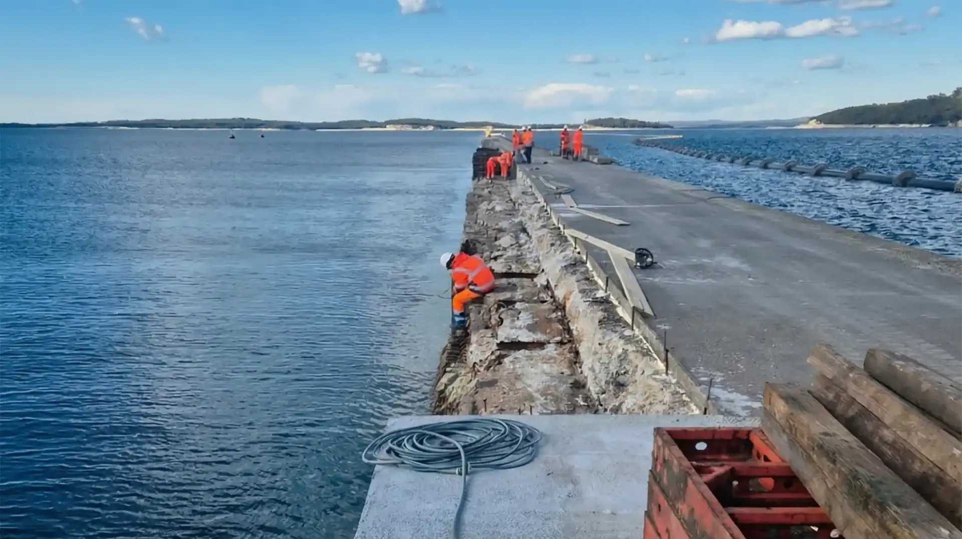 Wie der Direktor der Hafenverwaltung Pula, Dalibor Brnos, kürzlich erklärte, wurden in den letzten Wochen detaillierte Unterwasseraufnahmen der vertikalen Mauern des Wellenbrechers gemacht. In Kombination mit Luftbildaufnahmen von Drohnen wird daraus ein 3D-digitaler Zwilling des gesamten Bauwerks erstellt. Dieses hochpräzise digitale Modell ermöglicht es den Bauteams, den exakten Zustand der Unterwasserstruktur zu analysieren, bevor der eigentliche physische Eingriff beginnt. Parallel dazu wurden bereits die Baustelleneinrichtungen und Zugangswege vorbereitet.
