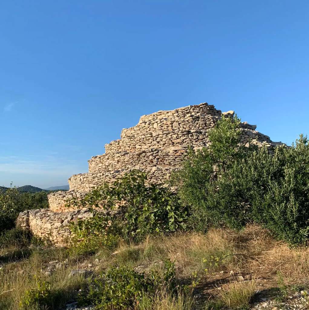 Es handelt sich dabei um ein Trockenmauerwerk, eine Pyramide aus Stein, die sich durch mehrere konzentrische Steinringe nach oben hin verjüngt.