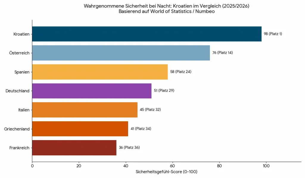 Ein zentraler Indikator für die Lebensqualität und Reisesicherheit ist die Frage, wie sicher sich Menschen nach Einbruch der Dunkelheit im öffentlichen Raum fühlen. Laut den aktuellsten Erhebungen von World of Statistics und dem Numbeo Safety Index (Stand Januar 2026) rangiert Kroatien zum wiederholten Male auf Platz 1 in Europa.