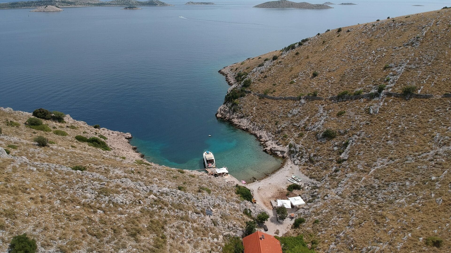 Direkt daneben haben jedoch vor drei Jahren Betreiber aus Murter eine kleine, urige Konoba mit einer Mole für maximal 2 Boote aufgemacht. Es gibt einfache Mahlzeiten, fangfrischen Fisch, ein gastfreundliches Lächeln auf den Lippen, und die eine oder andere Geschichte aus alten Tagen.
