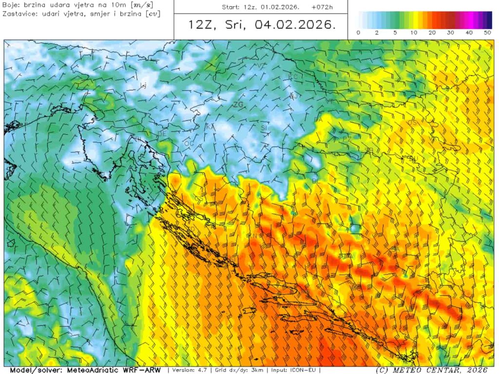 Die Prognosen weisen auf bis zu 50 Liter Niederschlag pro Quadratmeter hin, besonders am Nachmittag ist Jugo mit Windgeschwindigkeiten bis zu 100 km/h zu erwarten.